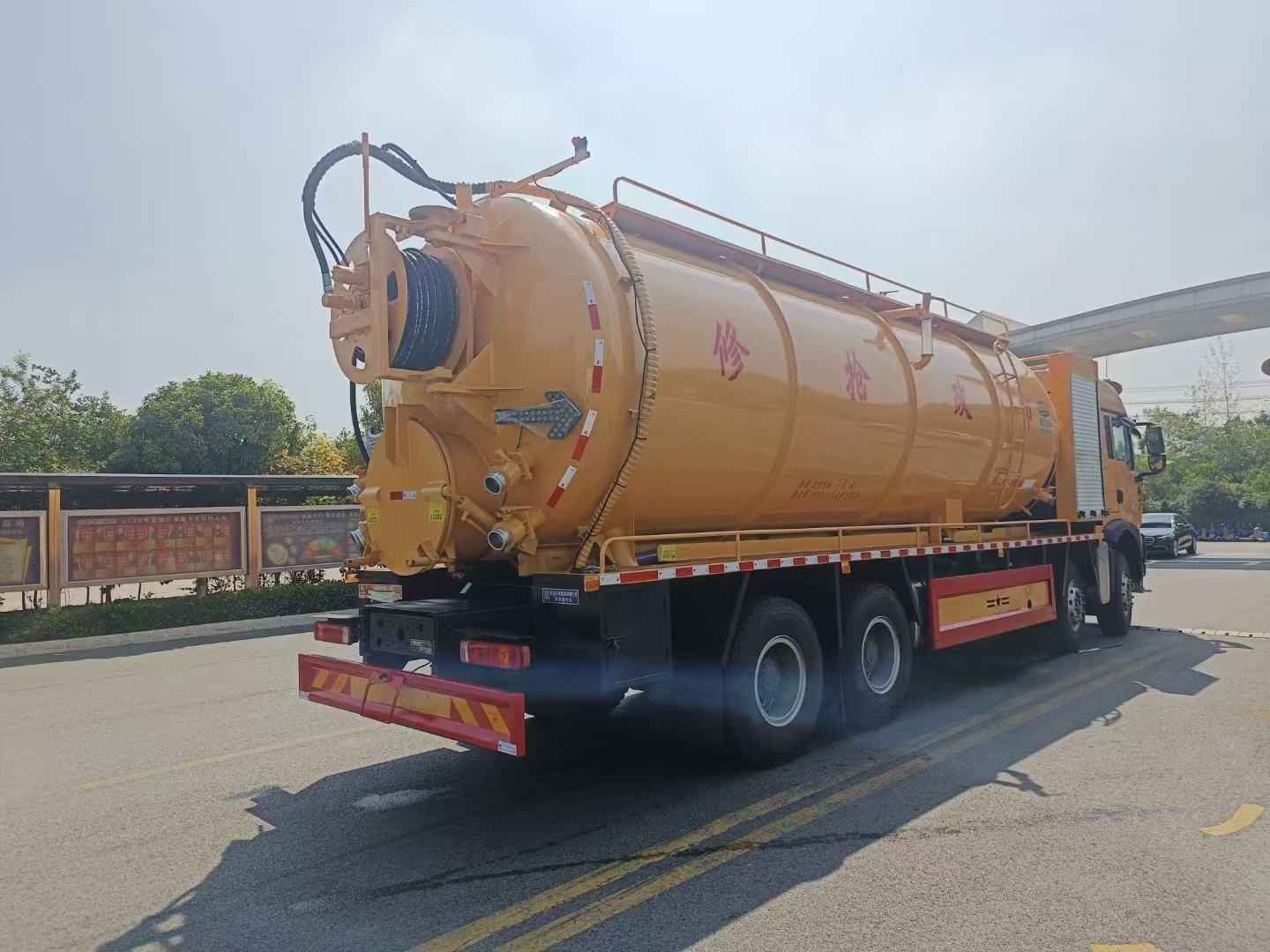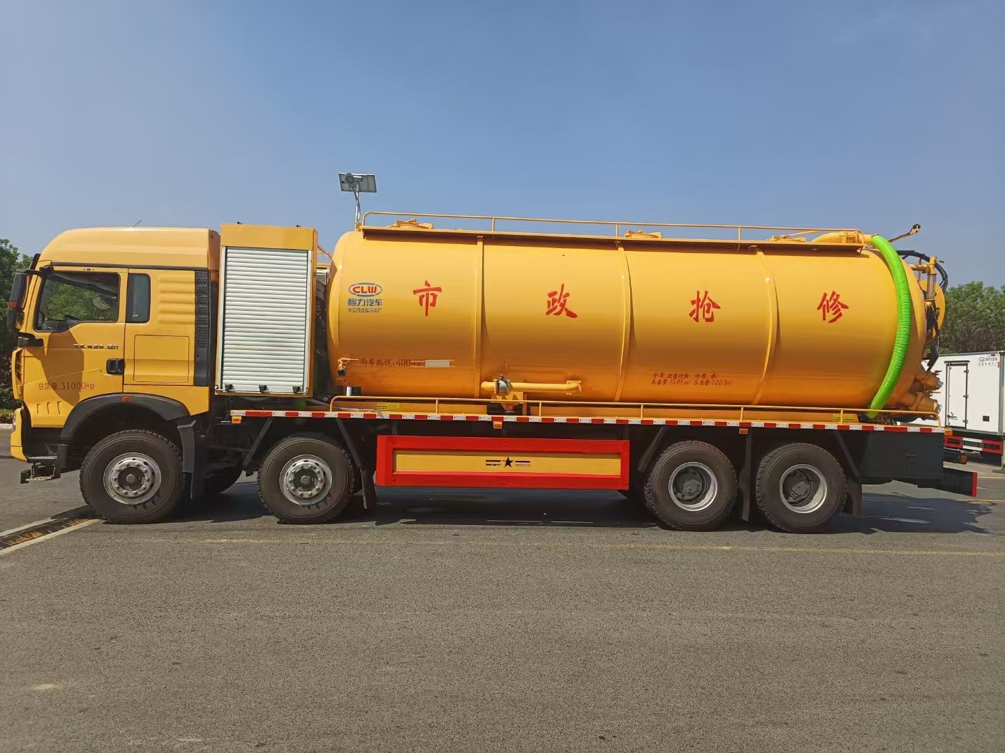 | 上裝配置 | 罐體總?cè)莘e約33立方,清水箱約10立方,其余為污水罐,加強大架,兩倉互通,采用8mm碳鋼制作,吸污部分,副發(fā)采用420馬力配258水循環(huán)泵,8米吸污管,罐體兩側(cè)加寬平臺加護欄,后部開一個600mm液壓開啟排污口,一個150排污球閥,和一個100的排污球閥,100內(nèi)抽球閥,后部左右各一個箭頭燈,配品浮350流量,配100米內(nèi)徑25定制耐磨高壓管,帶卷盤,卷盤液壓左右旋轉(zhuǎn)。 | ||